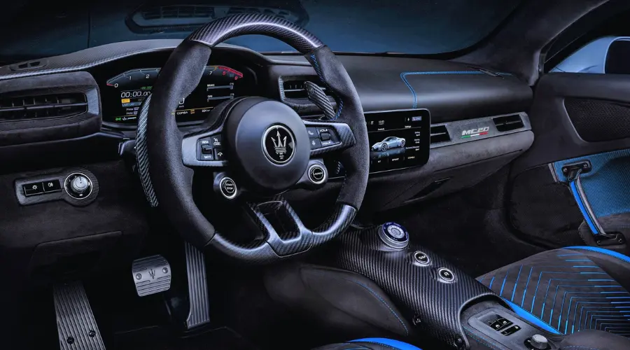 The MC Pura’s interior design combines luxury and driver-focused elements. It has a central touchscreen, a digital instrument cluster, and adjustable ambient lighting. It is covered in high-end leather and Alcantara. Since every control is set up perfectly, you can enjoy comfort, advanced infotainment, and driving modes that are easy to use and customised to your preferences.